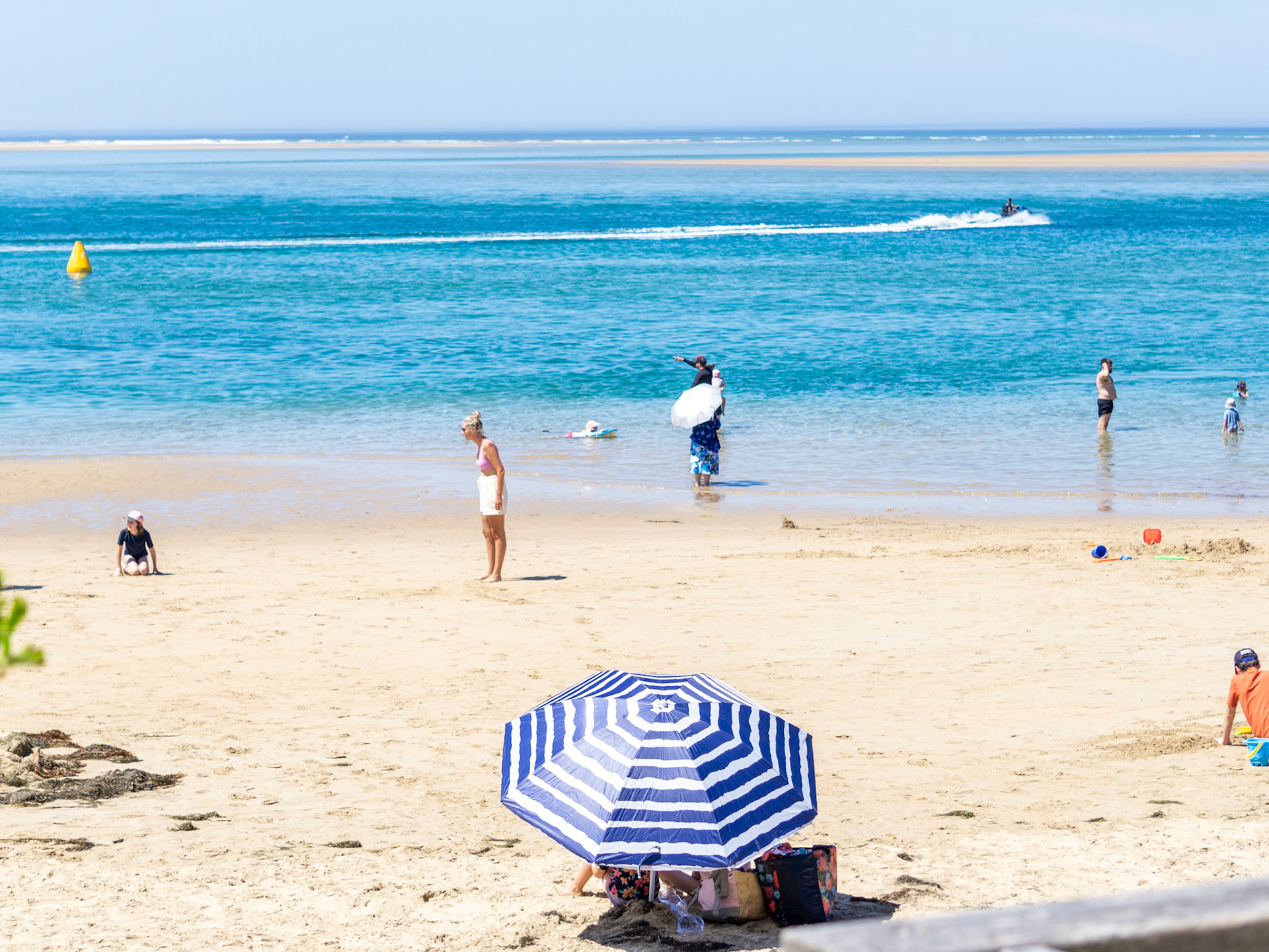 beach goers playing in the waves at boomer beach port elliot south australia